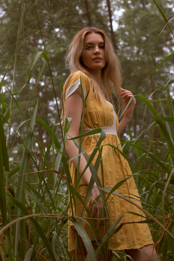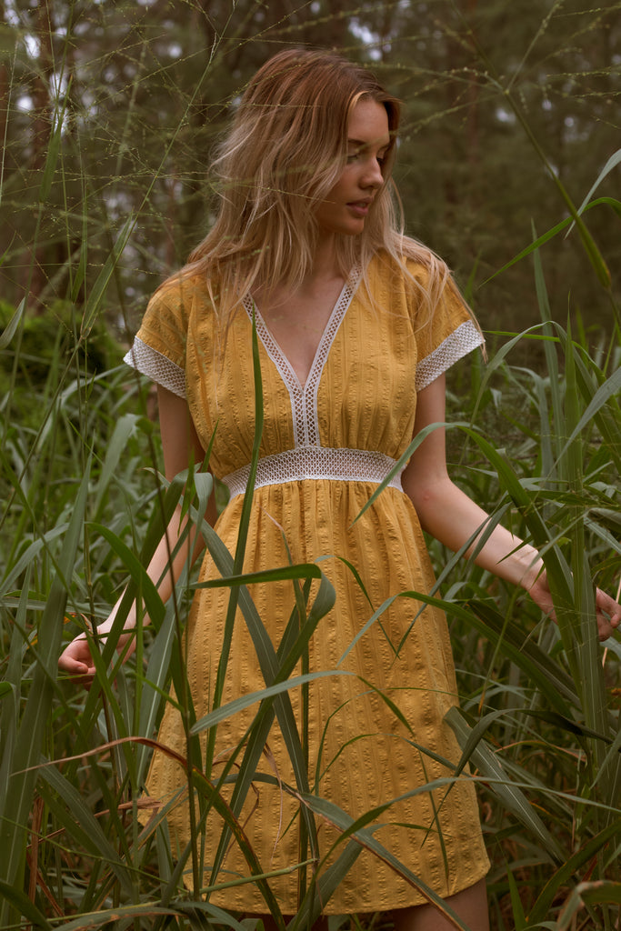Go on an adventure this vacation in our sweet V-neck dress with lace details and flared skirt. You can wear it so easily over your bikini and walk around on the island.