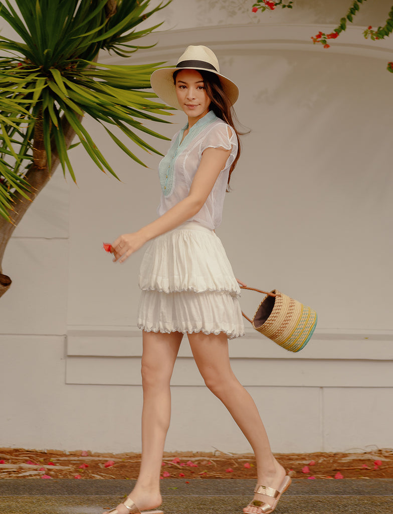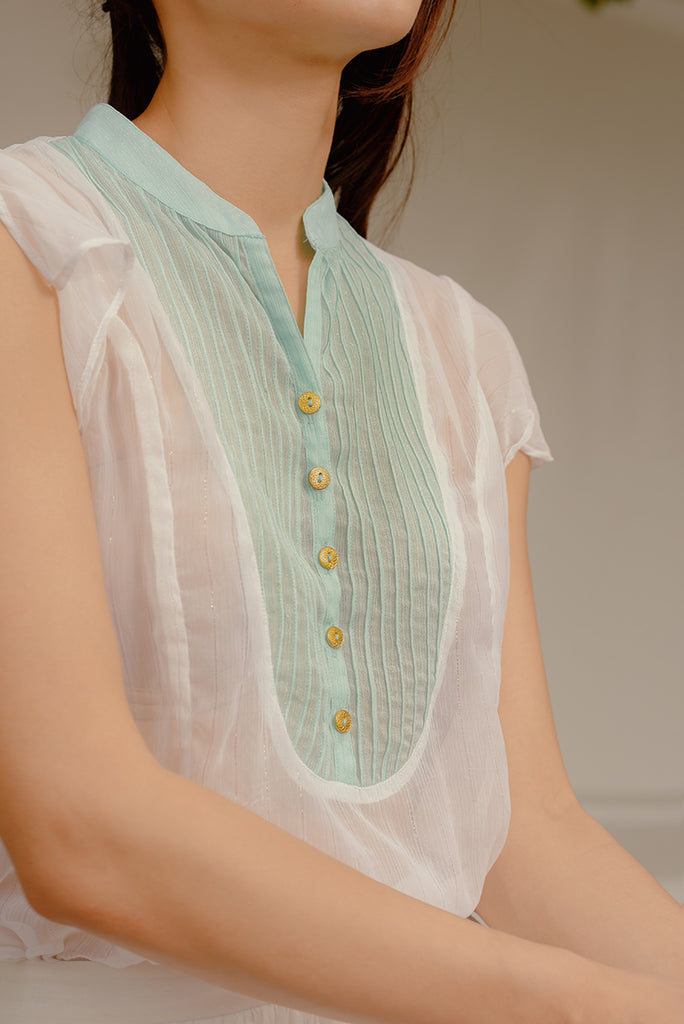 Made from sheer shimmery georgette, this top has intricate pleated yoke along the mandarin collar. The front is finished with gold colour buttons. This Sheer top can be worn as a cover up for your bikini or wear it with shorts and pair it up with bold sunglasses and a straw hat for some beach glamour.