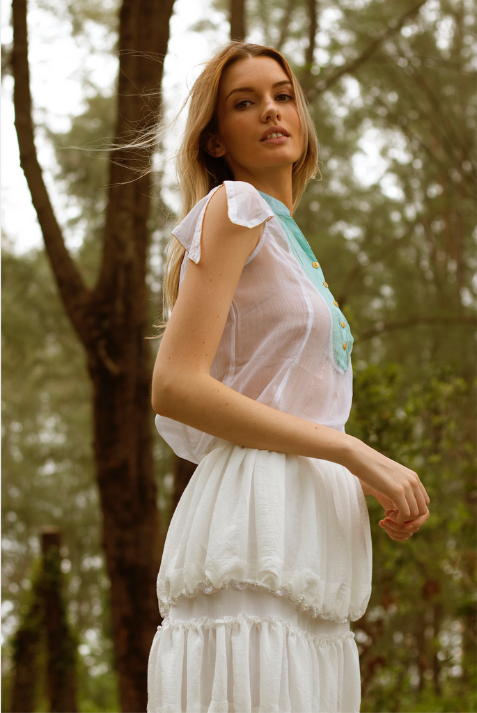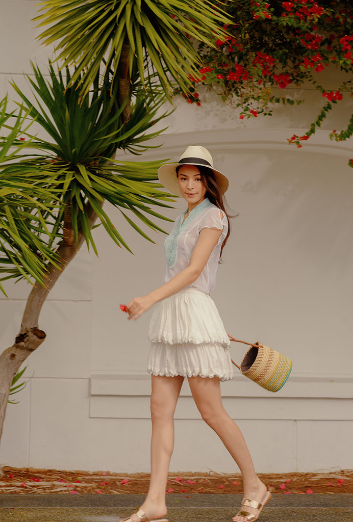 This skirt is cut from light weight crepe-blend and has flouncy tiers that accentuate its swishy A-line shape. It’s fitted with a comfortable elasticated waistband. Hem of both layers is finished with white beads trimming. Skirt styled to wear at hips and best advice to purchase one size down.